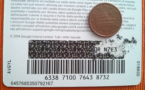 Le carte regalo Google Play sono delle semplici schede prepagate e sono del tutto simili ad una ricarica telefonica, con la striscia argentata che copre il codice da utilizzare sul Google Play. Sotto la striscia è presente il codice alfanumerico di 20 caratteri che è possibile inserirlo sul Google Play in due modi. Il primo accedendo al sito play.google.com/utilizza e quindi inserire il codice dopo aver effettuato il login con il nostro account Google.