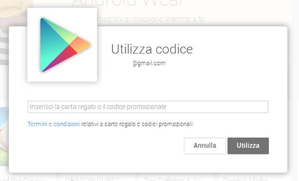 Il secondo metodo prevede l'inserimento direttamente dallo smartphone inserendo il codice sotto la voce Play Store presente in alto e poi cliccando su Codice promozionale e nella finestra che si aprirà dovrete inserire il codice che avete grattato dalla scheda.