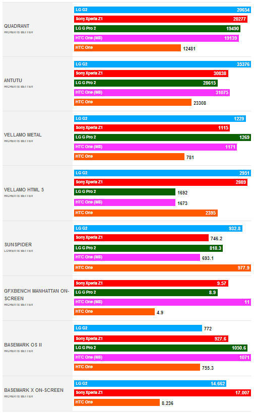 HTC ONE (2014)SAMSUNG GALAXY S5SONY XPERIA Z2LG G PRO 2Starting price$199-$249 (on-contract)N/AN/AN/AKnown Dimensions5.76 x 2.78 x 0.37 inches (146.36 x 70.6 x 9.35mm)5.59 x 2.85 x 0.32 inches (142 x 72.5 x 8.1mm)5.78 x 2.89 x 0.32 inches (146.8 x 73.3 x 8.2mm)6.22 x 3.22 x 0.33 inches (157.9 x 81.9 x 8.3mm)Weight5.64 oz. (160g)5.11 oz (145 g)5.57 oz. (158g)6.07 oz. (172g)Screen size5.0 inches5.1 inches5.2 inches5.9 inchesScreen resolution1,920 x 1,080 pixels (441ppi)1,920 x 1,080 (432ppi)1,920 x 1,080 pixels (424ppi)1,920 x 1,080 pixels (377ppi)Screen typeS-LCD3Super AMOLED Full HDTriluminos Full HD (IPS)Full HD IPSBattery2,600mAh (non-removable)2,800mAh (user removable)3,200mAh3,200mAh (user removable)Internal storage16GB/32GB16GB/32GB16GB16GB/32GBExternal storagemicroSD (up to 128GB)microSD (up to 128GB)microSD (up to 64GB)microSDRear camera4MP, UltraPixel sensor, Duo Camera, dual LED Smart Flash, BSI sensor16MP, LED flash20.7MP, LED flash13MP, LED flash, OIS+Front-facing cam5MP2MP2.2MP2.1MPVideo capture1080p4K4K4KNFCYesYesYesYesBluetoothv4.0v4.0v4.0v4.0SoC2.3GHz Qualcomm Snapdragon 801(2.5GHz variant in Asia)2.5GHz Qualcomm Snapdragon 8012.3GHz Qualcomm Snapdragon 8012.26 GHz Qualcomm Snapdragon 800GPUAdreno 330Adreno 330Adreno 330UnspecifiedRAM2GB2GB3GB3GBWiFi802.11a/ac/b/g/n, dual-band802.11a/ac/b/g/n, dual-band802.11a/ac/b/g/n, dual-band802.11a/ac/b/g/n, dual-bandOperating systemAndroid 4.4Android 4.4Android 4.4Android 4.4Standout featuresUltraPixel sensor, Duo Camera, HTC Sense 6, Zoe, BoomSound, BlinkFeed, Extreme Power Saving ModeFingerprint scanner, heart rate sensor, Ultra Power Saving Mode, IP67 certified, 4K videoIP58 certified, BRAVIA screen tech, Exmor RS camera, 4K videoKnockCode, Backside buttons, Mini view, Multi Window
