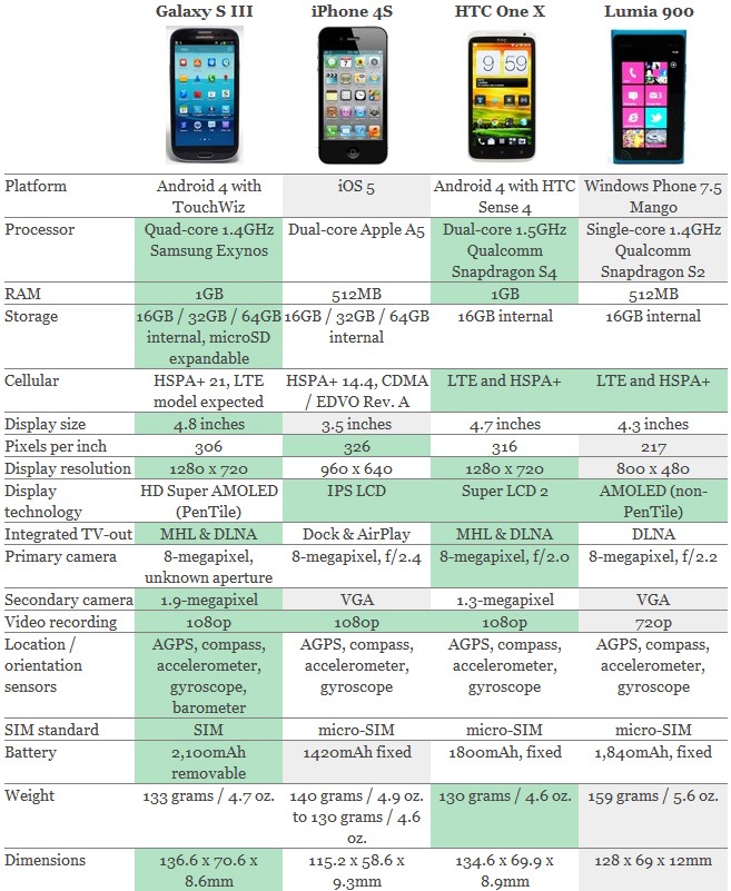 Per concludere vi ripropongo, di seguito, la scheda tecnica di confronto tra Galaxy S 3 e iPhone 4S.