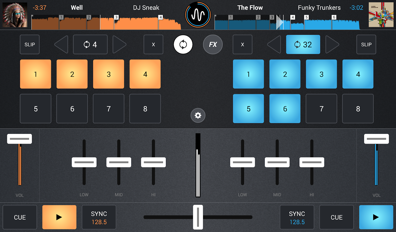 - 2 turntables, crossfader, full-fledged 3-band EQ mixer.