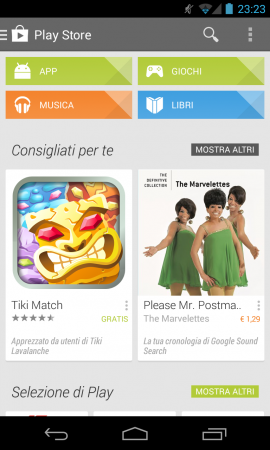 Come ci aspettavamo, al momento purtroppo non è presente la sezione Play Devices, che in teoria dovrebbe consentire di acquistare smartphone e tablet di Google direttamente dal Play Store Android. Probabilmente la sezione sarà aperta inizialmente solo negli USA e dopo la presentazione ufficiale di Android 4.4 e del Nexus 5.