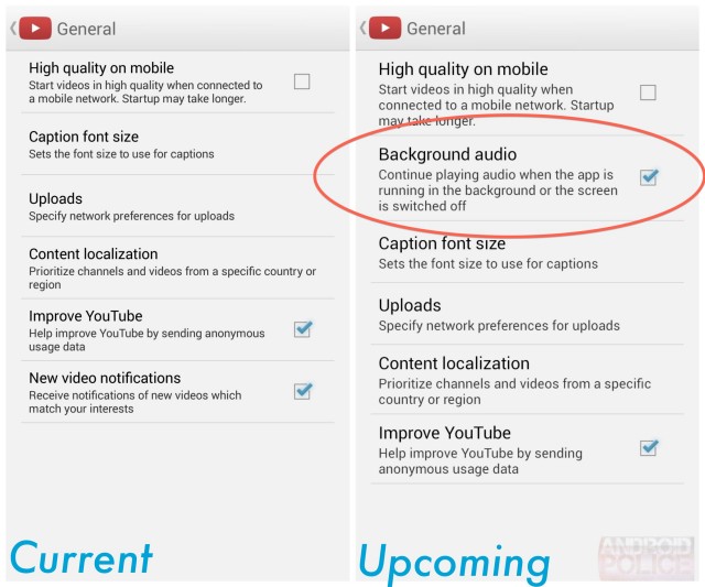 Al momento questa nuova versione non sembra introdurre nessuna novità rilevante rispetto a quella precedente, se non che nel menù è comparsa una voce che in futuro permetterà di attivare la riproduzione audio in background, per poter usare YouTube come una sorta di radio per ascoltare musica gratuitamente in streaming. In pratica, grazie a questa funzione, sarà possibile avviare la riproduzione di un video per continuare a sentirne l'audio anche quando apriremo un'altra applicazione o andremo a spegnere lo schermo. Fantastico, è una funzione che aspettavamo da parecchio tempo!