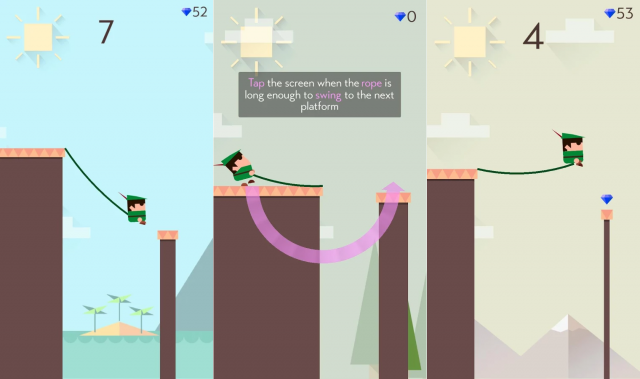 Swing è un gioco simile a Flappy Bird come modalità di gioco: sembra semplice, ma non lo è e richiede davvero tanta precisione. Se la fune è troppo corta, mancherete la piattaforma. Se è troppo lunga vi schianterete. E proprio questo rende il gioco "addictive".