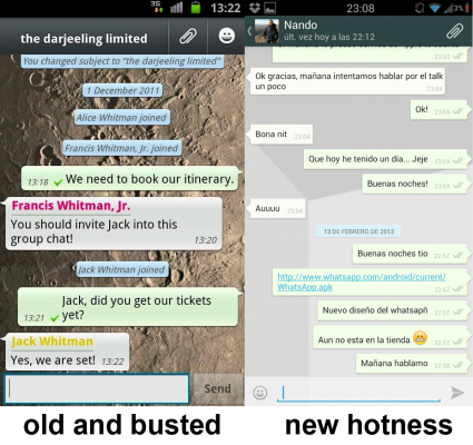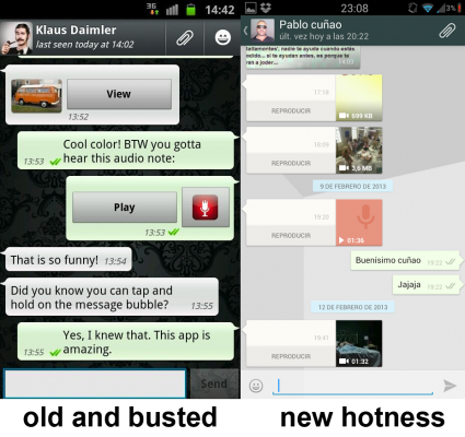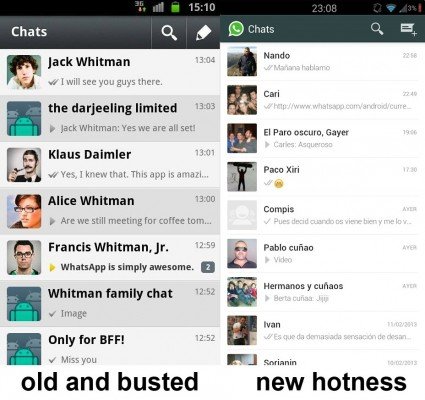 Gli sviluppatori di WhatsApp, infatti, hanno rilasciato durante la notte una nuova versione beta di WhatsApp per Android e questa volta viene finalmente introdotto il tema Holo. Le funzioni del programma restano invariate, ma arriva finalmente un nuovo design per l'interfaccia grafica, che ora si integra al meglio con il nostro sistema operativo Android.