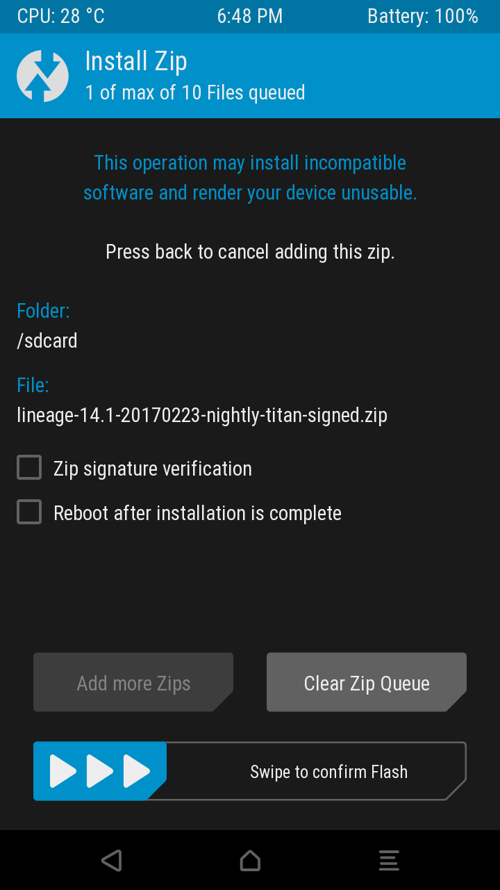 - Dopo aver scelto il firmware Lineage OS, nella schermata successiva seleziona Add more zips e seleziona l’archivio con le Google Apps