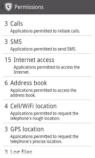 GData AntiVirus Free tra le altre caratteristiche, come Antivirus e protezione in generale, permette di tenere sotto controllo un elenco di tutte le autorizzazioni delle applicazioni installate. Una panoramica delle autorizzazioni fornite sono visualizzate in pratiche sotto categorie, in modo da trovare facilmente il numero di applicazioni che hanno un permesso specifico. Si noti che questo include applicazioni installate dal costruttore, da Google e dal Proprietario del telefono.