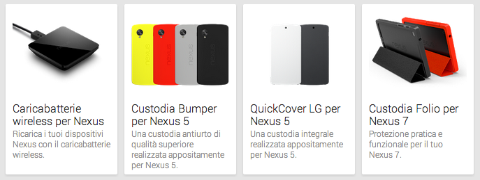 Contrariamente ai dispositivi di cui vi abbiamo parlato fino ad ora, infatti, questi accessori riguardano anche il nostro Paese. In Italia, infatti, sono stati inseriti nuovi accessori per Nexus 5 e Nexus 7 sul Play Devices. Vediamoli insieme.