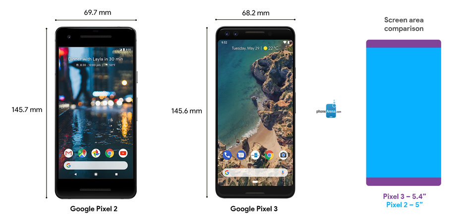Google Pixel 3 e Pixel 3 XL dimensioni