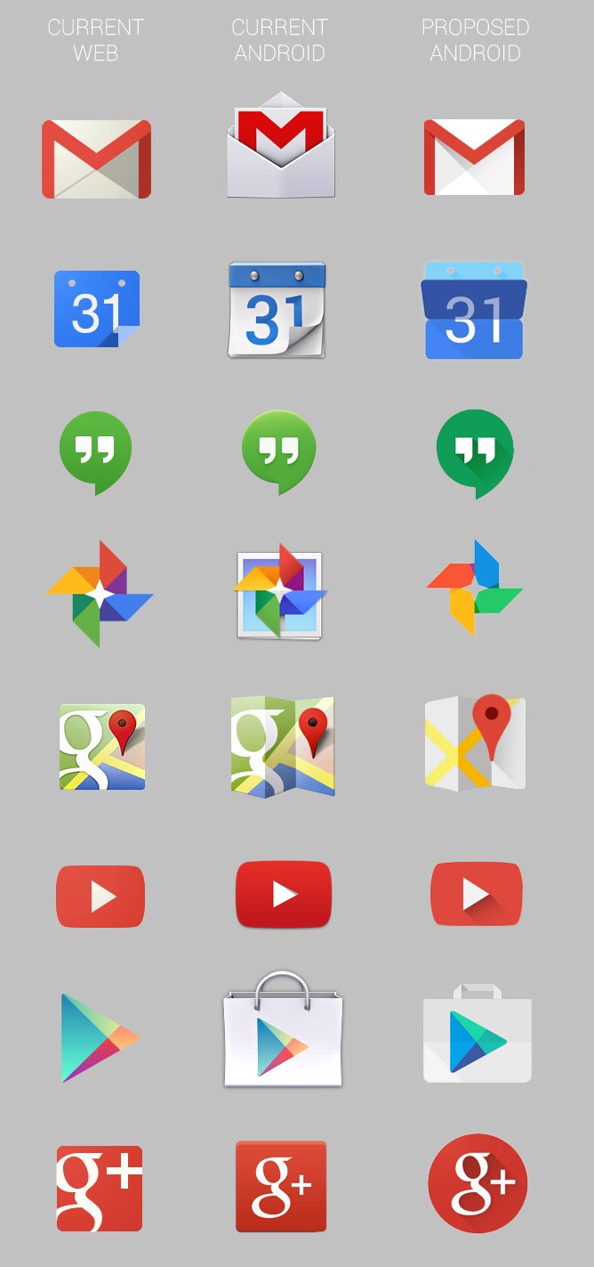 Per maggiore completezza di dettagli, di seguito potete invece dare un’occhiata ad un’immagine che mette a confronto le nuove icone di Google per Android con quelle dei servizi web Google e delle attuali app. Le differenze sono evidenti e il risultato finale, come detto, è davvero bello: moderno, colorato, flat.