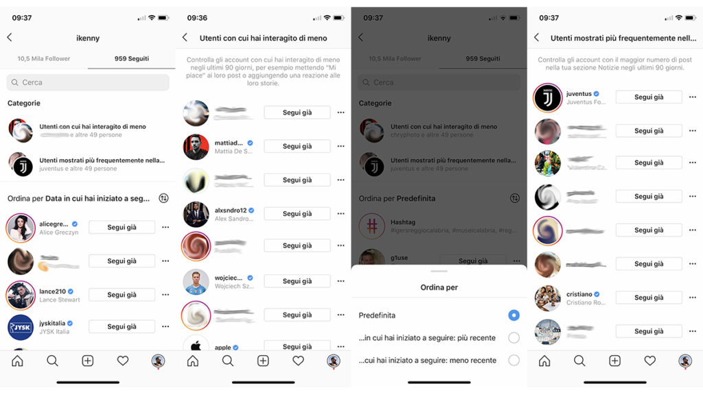 - Data in cui hai iniziato a seguire: più recenti. Molto semplice: mostra prima gli utenti che hai iniziato a seguire di recente, poi a cascata tutti gli altri più vecchi