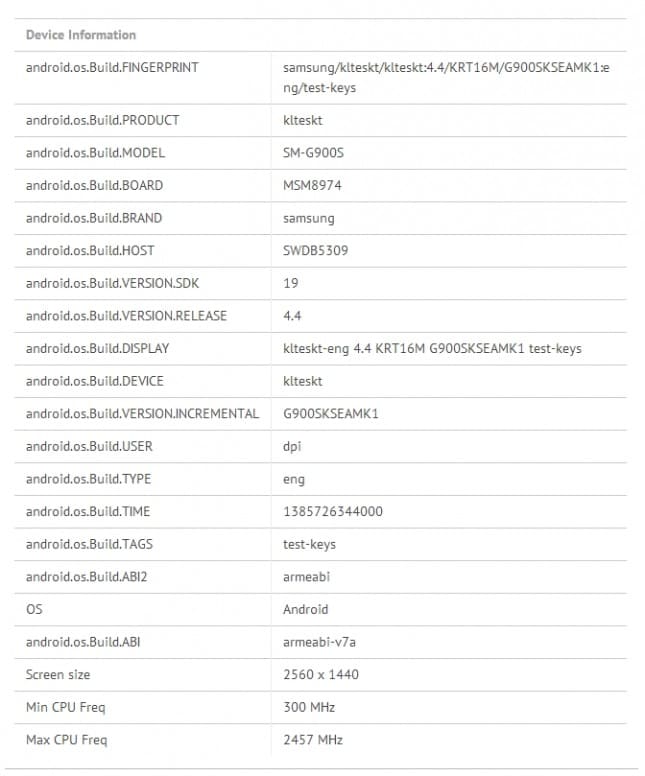 Intravisto un probabile Galaxy S5 con display con risoluzione 2K, CPU da 2.5 GHz ed Android 4.4 KitKat