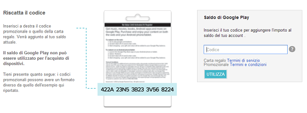 Ecco l'immagine della pagina di Google in cui si può riscattare il codice delle Google Play Gift Cards.