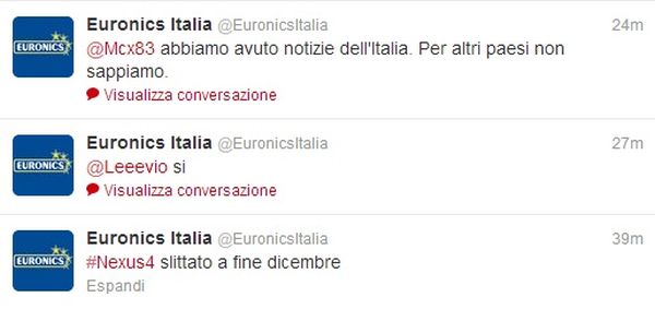 Il Nexus 4 in Italia non arriverà prima della fine di Dicembre. La notizia è stata confermata da Euronics pochi minuti fa su Twitter.