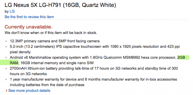 LG Nexus 5X: confermate tutte le specifiche da Amazon India. Sì, anche i 2 GB di RAM.