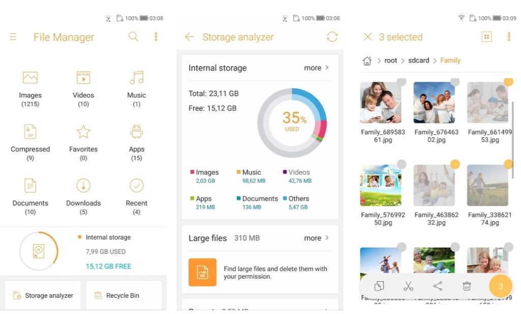 Con un design semplice ed esteticamente gradevole, Asus File Manager ha una bellissima schermata a categorie che consente di organizzare ed etichettare i file. È compatibile con una serie di servizi di cloud storage come OneDrive, Google Drive e Dropbox, consente di comprimere e decomprimere file rar e zip e di trasferire file tra telefono e PC, in WiFi.