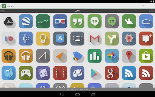 Le icone del tema sono realizzate con una grafica piatta, minimale e in un certo senso Holo, ma potete vederle meglio negli screenshot a fine articolo. Lumos è un icon pack con cui è possibile personalizzare in parte l’aspetto del proprio dispositivo Android con un tema semi-traslucido ed icone leggermente squadrate: in poche parole, un must have per gli amanti di questo genere di icone.