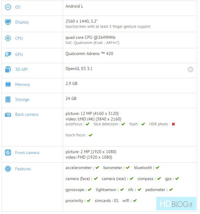 Come possiamo vedere dall'immagine che segue, viene confermato Snapdragon 805 con Adreno 420, 3GB di RAM, display QHD e una diagonale di 5.2 pollici!