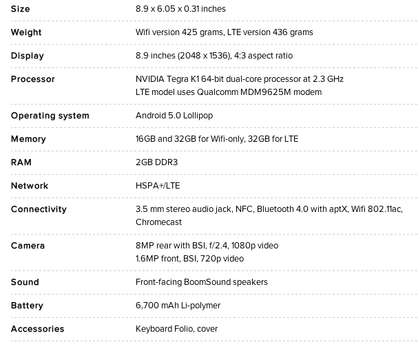 Come era lecito aspettarsi, sono state confermate tutte le caratteristiche fino ad oggi emerse. Il Nexus 9 sarà il primo prodotto, insieme al Nexus 6, a montare Android Lollipop 5.0 come sistema operativo.