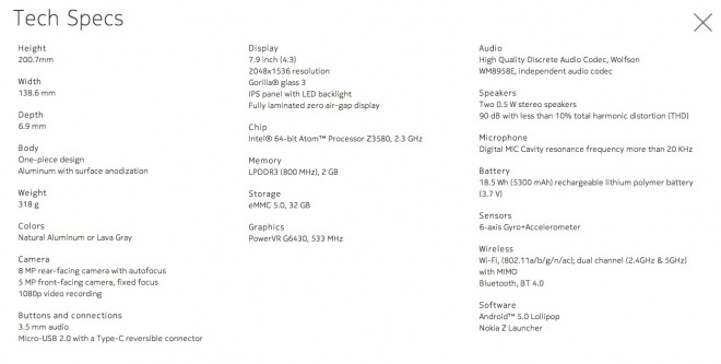 Prima di tutto vediamo la scheda tecnica completa di questo tablet Android Nokia N1: