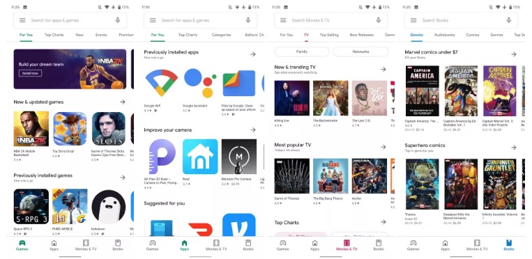Tra le altre novità, arriva la barra di navigazione inferiore, con collegamenti veloci ad applicazioni, giochi, film e libri, mentre le varie sezioni restano visibili in alto, senza alcuna distinzione cromatica tra le schede.