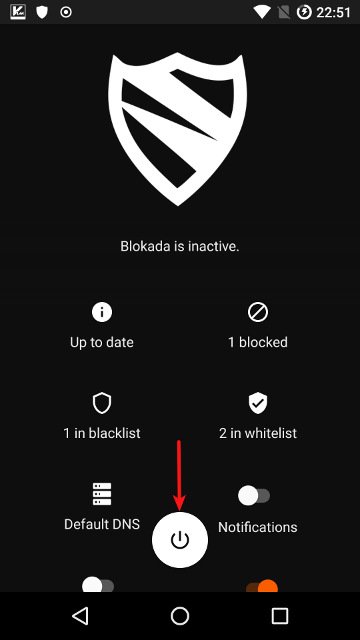 Se vuoi disattivare tutte le notifiche che Blokada invia di default,devi semplicemente cliccare sull'apposito switch che trovi nella schermata principale.