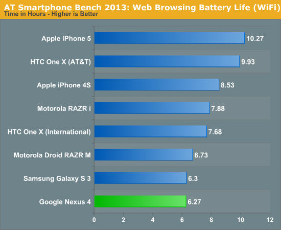 Tra i concorrenti troviamo smartphone come iPhone 4 e Galaxy Nexus, che di certo non sono noti per la loro grande autonomia. Ma Nexus 4 non è da meno, e riesce quasi a fare peggio di questi dispositivi, nonostante sia dotato di una batteria da ben 2100mAh, che dovrebbe garantire almeno un'autonomia pari a quella di iPhone 5, o comunque solo leggermente inferiore. Non si spiega, invece, il consumo esagerato di batteria mostrato dal Nexus 4, che sfigura senza troppi giri di parole di fronte alla concorrenza.
