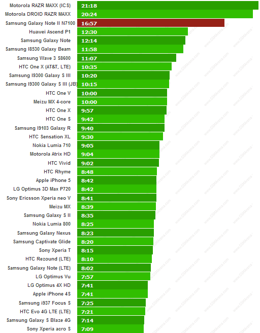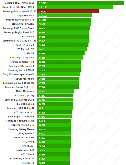 Infine il test della riproduzione di un video in modo continuativo mostra che il Note II raggiunge le 11 ore e 27 minuti contro le 10 ore del Galaxy S III e dell’iPhone 5.