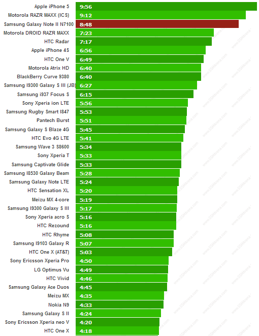 Per quanto concerne la prova sulle chiamate in 3G, il nuovo Galaxy Note II fa registrare degli ottimi risultati, visto che riesce a raggiungere addirittura le 16 ore e 57 minuti contro le 10 ore e 15 minuti del Galaxy S III e addirittura le 8 ore e 42 minuti dell’iPhone 5.