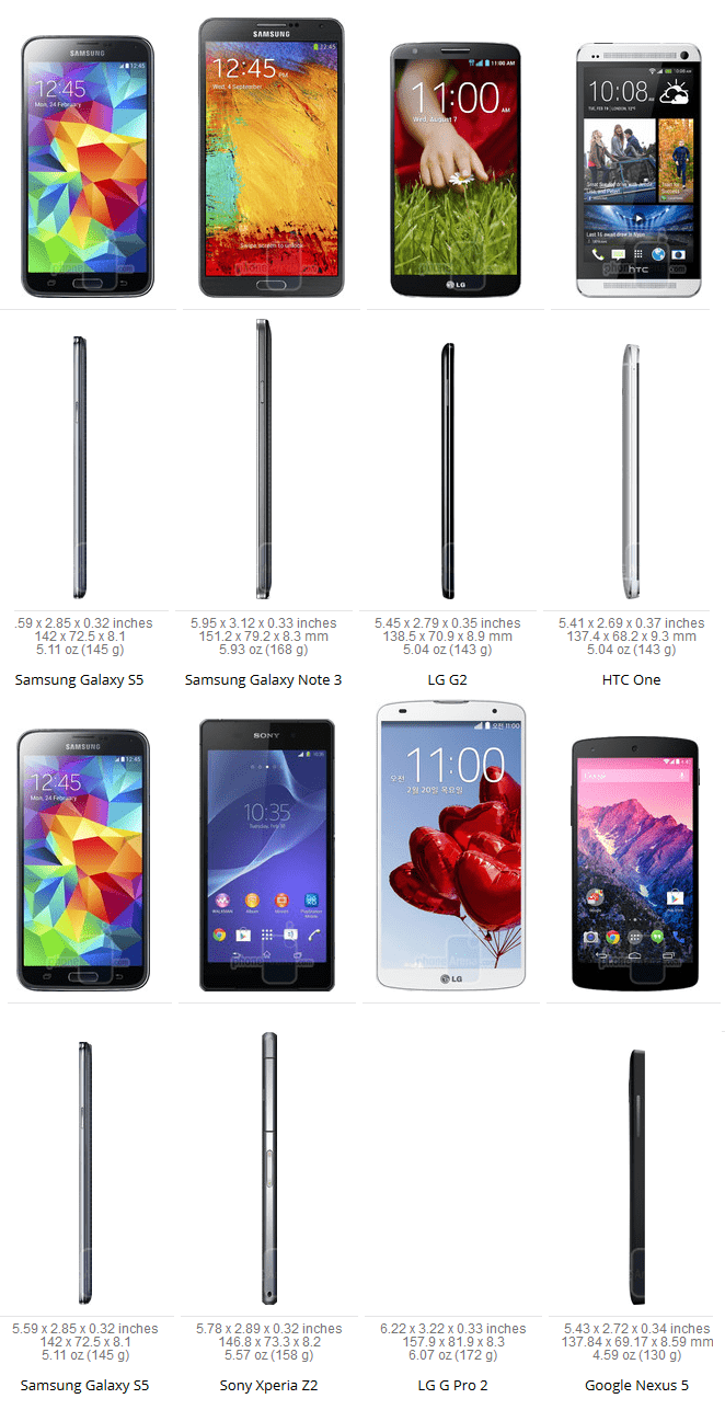 Quanto è grande il Galaxy S5? S5 vs Note 3 vs G2 vs One vs Z2 vs G Pro 2 vs Nexus 5