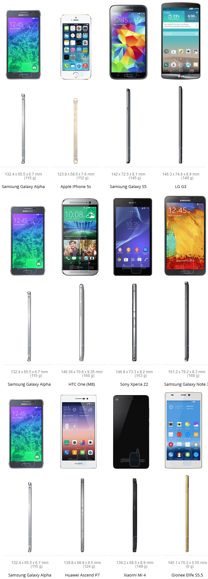 Quindi in questo articolo andremo a vedere un bel foto confronto con i maggiori smartphone del momento come iPhone 5S, Galaxy S5, LG G3, Note 3, One M8, Xperia Z2, Ascend P7 ed altri in modo da avere un quadro completo sulle reali dimensioni del Galaxy Alpha.