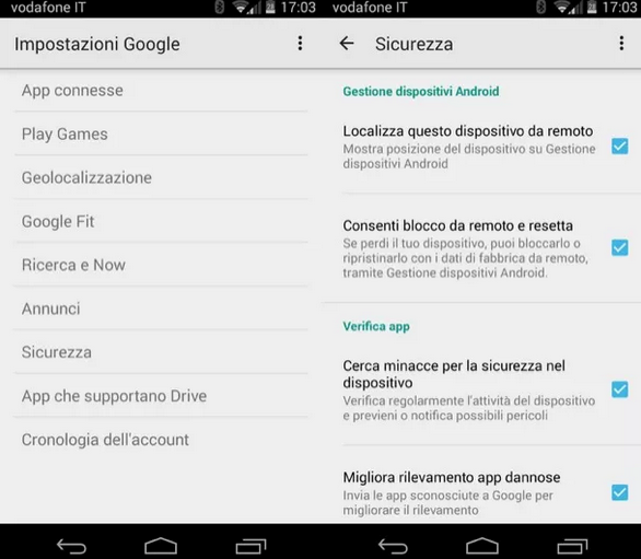 Nella schermata che si apre, selezionate la voce "Sicurezza" e mettete il segno di spunta accanto alle voci "Localizza questo dispositivo da remoto" e "Consenti blocco da remoto e resetta" per abilitare la possibilità di trovare il telefono su una mappa online e ordinare la cancellazione di tutti i dati contenuti in esso da remoto.