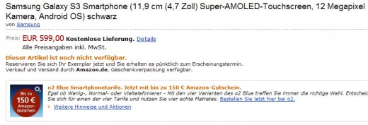 Mentre la presentazione ufficiale del Galaxy S 3 è attesa per i primi giorni di Maggio a Londra, il sito Amazon Germania ha già messo in preordine il nuovo smartphone di Samsung.