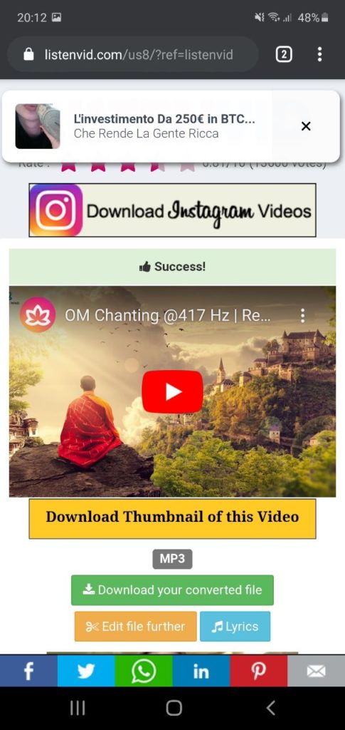 - se tutto è andato bene, vedrai l’anteprima del video di YouTube, potrai ascoltarlo in formato audio, potrai scaricarlo in formato MP3 (quindi come canzone) cliccando sul pulsante verde Download your converted file
