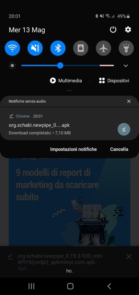 Terminato il download del file APK, trascina verso il basso la tendina delle notifiche. Vedrai il nome del file appena scaricato: devi cliccarci sopra per avviare l'installazione.