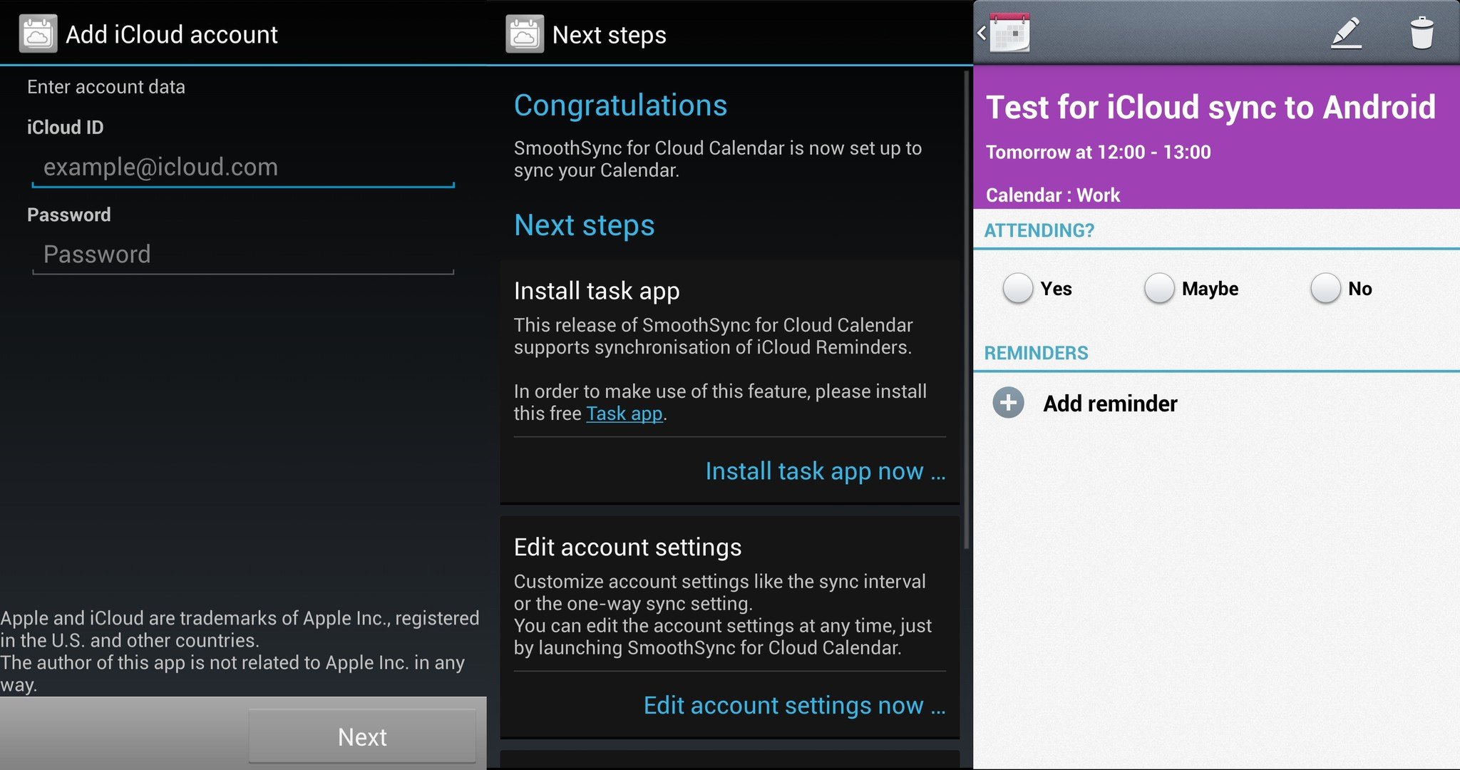 SmoothSync for Cloud Calendar vi permettte infatti di importare tutti gli eventi di iCloud all'interno del calendario di Google e Android in modo estremamente facile e immediato. Una volta scaricata l'applicazione dal Play Store, dovete semplicemente inserire i vostri dati di iCloud per avviare la sincronizzazione.