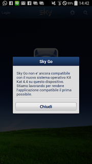 In pratica, adesso non basta acquistare uno smartphone/tablet Samsung per guardare Sky Go su Android, ma bisogna anche evitare di aggiornarlo ad Android 4.4 KitKat, altrimenti Sky Go non funziona! E' veramente incredibile, sembra una barzelletta: uno paga 80 euro al mese un fottuto abbonamento e non riesce neanche ad utilizzarlo come vorrebbe.