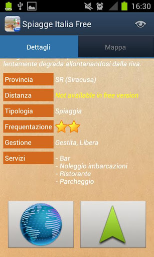 La pagina principale consta di un'immagine introduttiva per presentare la spiaggia e la valutazione, espressa in stelline, che indica la frequentazione in media del luogo e se è libera o in gestione; qualora non si riuscisse a raggiungere la spiaggia è disponibile la modalità "navigatore" che ci guiderà immediatamente presso la destinazione selezionata tramite Google Maps.