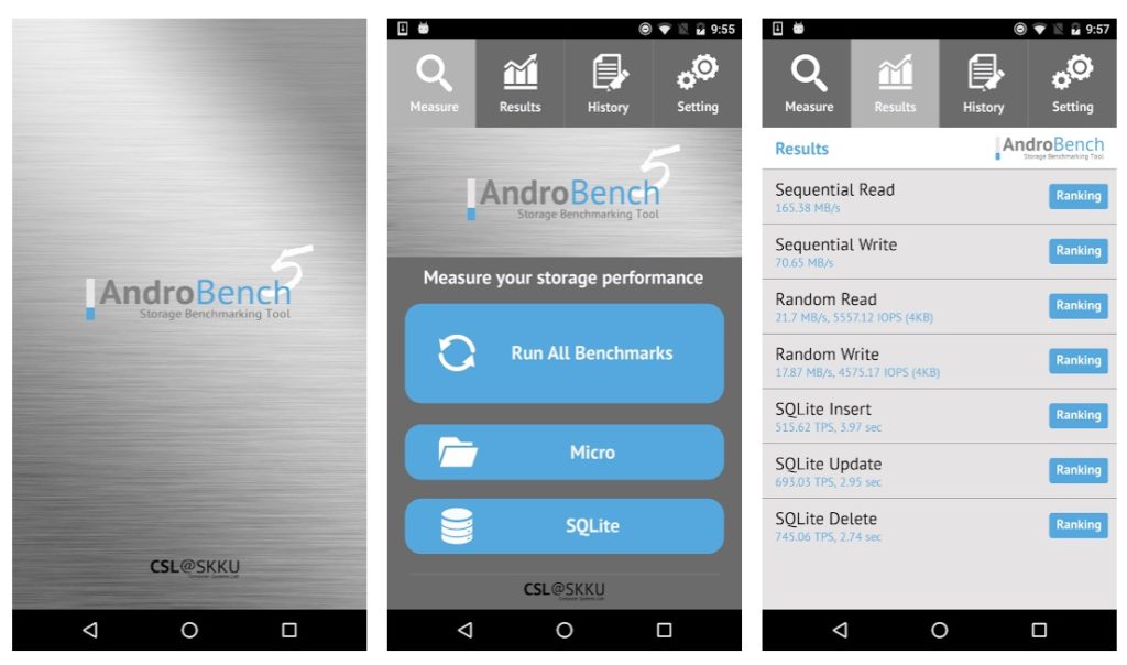 Utile per misurare le prestazioni della memoria dello smartphone. Veramente ottima, peccato che sia poco conosciuta. Con questa app andrebbero testati e confrontati tutti i telefoni (ed anche microSD di un certo livello).