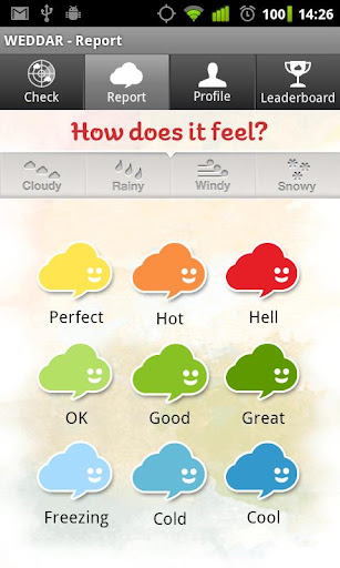 A proposito di nuvolette, in totale ne abbiamo nove, ognuna indica una condizione atmosferica differente, da quella azzurra che indica "congelato" a quella rossa di "caldissimo", inoltre per ogni agente atmosferico come pioggia, neve, vento ecc è presente una scala da 1 a 3 per indicarne l'intensità; non finisce qui, per ogni status pubblicato si guadagnano dei crediti che servono a scalare la classifica del migliore meteofilo, insomma uno stimolo in più per tutti gli utenti.