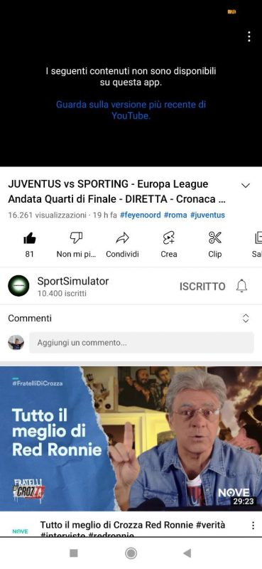 "I seguenti contenuti non sono disponibili su questa app. Guarda sulla versione più recente di YouTube."