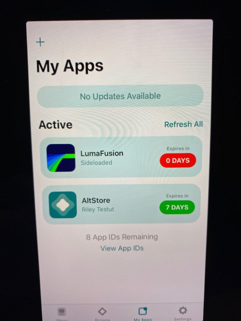 Come si nota chiaramente, il programma AltStore riporta il messaggio "Expires in 0 Days" relativamente al programma LumaFusion, che di conseguenza ha smesso di funzionare e non permetteva più l'apertura (con il rischio di perdere tutti i file al suo interno).