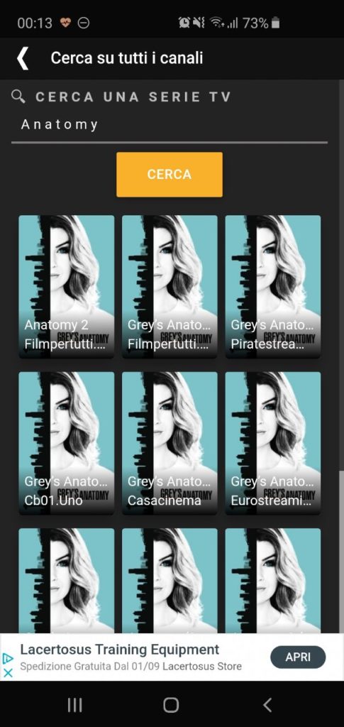 - In pochi istanti l'app farà una ricerca tra i canali e ti farà vedere tutti gli episodi che ha trovato relativamente alla serie tv di tuo interesse (dovrai guardare uno spot pubblicitario gratuito per avviare la ricerca)