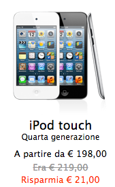 L’iPod Touch 4G viene scontato di 21€ nella versione da 16GB e sempre di 21€nella versione da 32GB