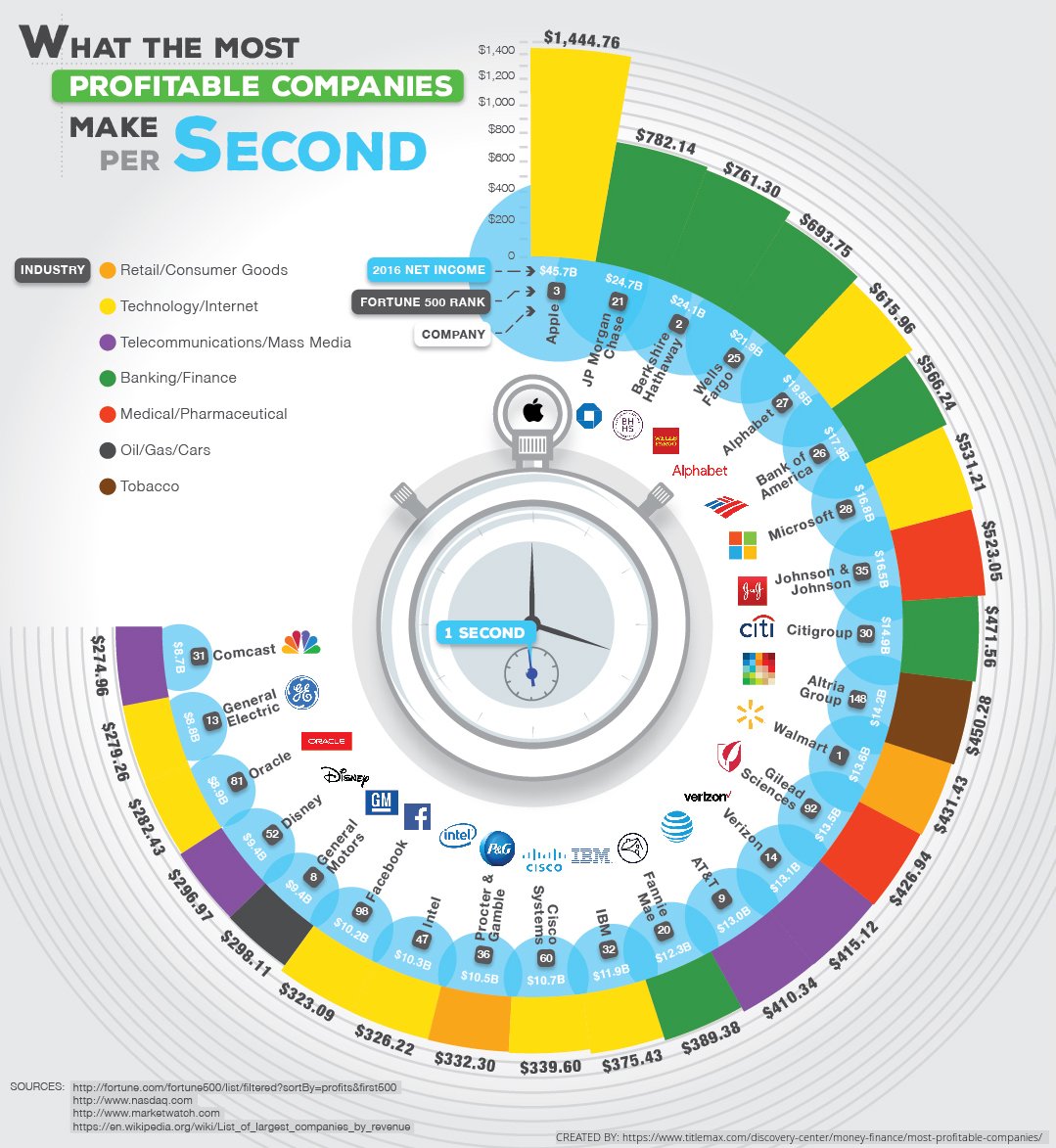 Guadagni da sogno per Apple che guadagna uno stipendio mensile al secondoDal report creato da Visually, emerge dai fatturati del 2016 che Apple è l'azienda che ha i profitti più alti al mondo staccando Google, Microsoft, JP Morgan ed altri colossi.