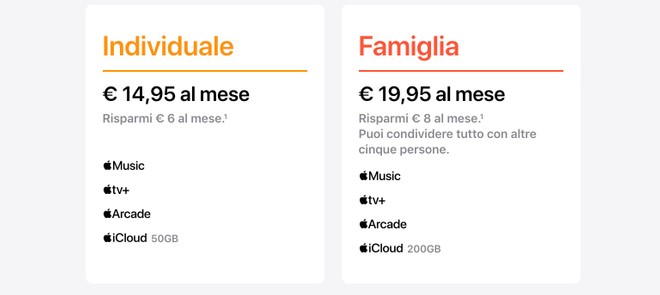 NOTA: i piani previsti per il mercato italiano comprendono Music, TV+, Arcade e iCloud