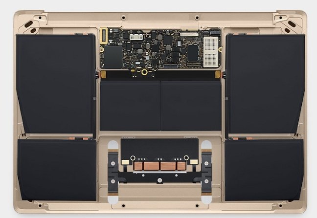 La tastiera è più grande rispetto alla precedente versione ed il display Retina è spesso appena 0,88mm e consuma il 30% in meno del precedente. Il trackpad, Force Touch trackpad, ha una superficie in vetro, con sensore di forza come sull'Apple Watch con ritrorno di un feedback tattile e supporto alle gesture. Le porte sono USB Type C, Display Port, Power, VGA e HDMI.