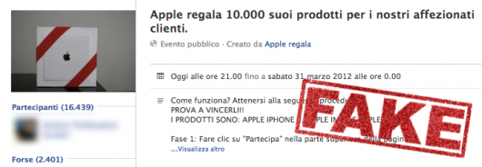 In sostanza su Facebook sta crescendo a ritmi vertiginosi una nuova pagina che promette di regalare prodotti Apple a tutti i fan. Si parla di 10.000 prodotti tra iPhone, iPod e Mac. Ovviamente, però, si tratta di una bufala. Apple non regala niente a nessuno, non fornisce nemmeno i prodotti ai siti web per le recensioni, figuriamoci se regala 10.000 prodotti ai fan di un falso gruppo su Facebook.