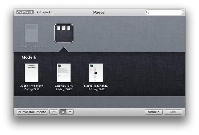 Quando si seleziona la voce di menu Archivio/Apri (⌘-O), si aprirà una finestra del Finder tradizionale, con due nuovi pulsanti nella parte superiore, uno chiamato “iCloud,” l’altro “Sul mio Mac”. Se si fa click su “iCloud,” si mostrano le anteprime dei documenti memorizzati su iCloud con la possibilità di trascinare nuovi documenti direttamente nel pannello e organizzarli con un semplice drag and drop (se non si utilizza la modalità vista elenco).