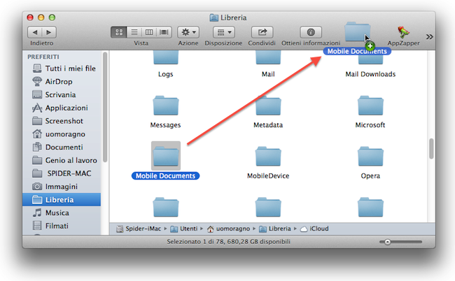 Trucchetto bonus: quango vi trovate nella Libreria della vostra Home, trascinate la cartella Mobile Documents nella barra superiore della finestra del Finder, in modo da potervi accedere più velocemente la prossima volta.